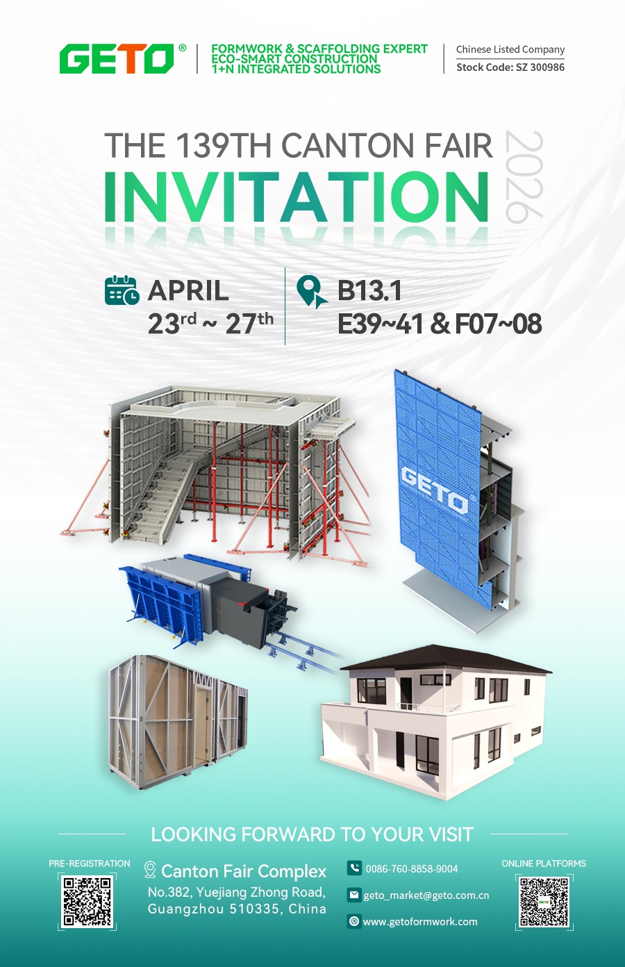 La 139.ª Feria de Importación y Exportación de China (Feria de Cantón) , Sesión de Primavera, Fase II , se celebrará del 23 al 27 de abril de 2026. GETO, la primera empresa cotizada en bolsa en el sector de encofrados y andamios para la construcción sostenible y líder en su sector, participará con un espacio de exposición doble, presentando una completa gama de soluciones en encofrados, andamios y construcción modular para la construcción sostenible. Invitamos cordialmente a socios de todo el mundo a visitar nuestros stands, explorar oportunidades de cooperación y expandir conjuntamente el mercado.