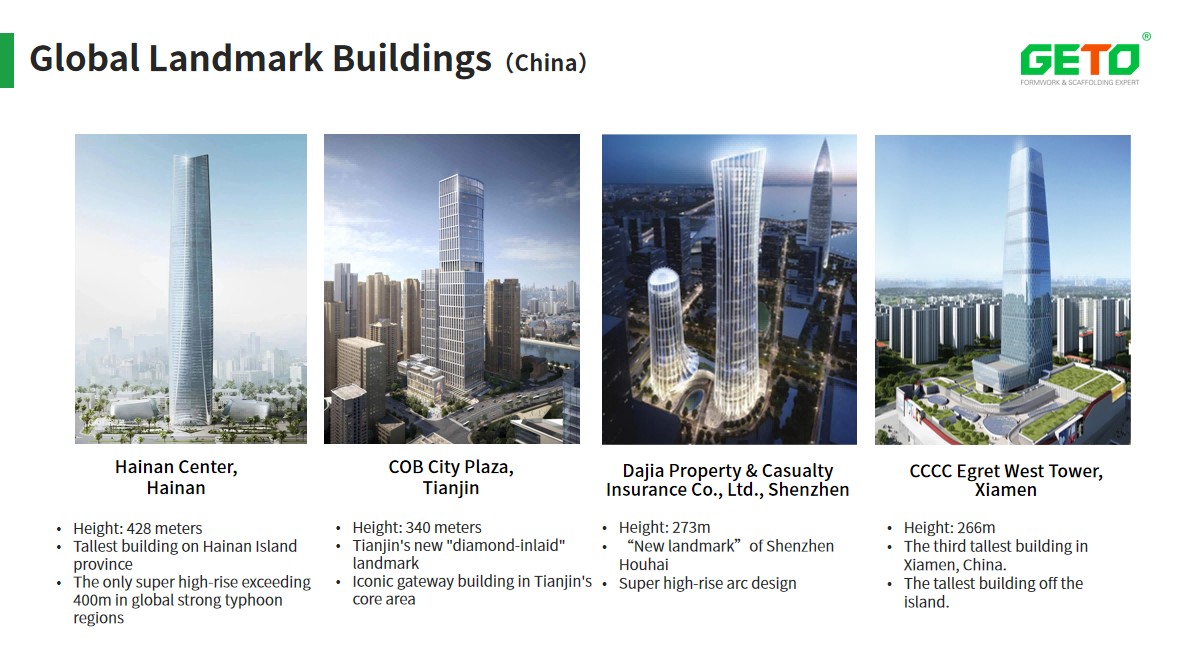 Edificios emblemáticos: Proyectos internacionales en el norte de África, el sudeste asiático y el sur de Asia superan los desafíos de la construcción de rascacielos y se adaptan a las necesidades de desarrollo de las principales áreas de mercado. Rascacielos emblemáticos como el Hainan Center, el Tianjin City Plaza y la sede de Shenzhen Dajia Insurance siguen contribuyendo a la modernización del paisaje urbano de China.