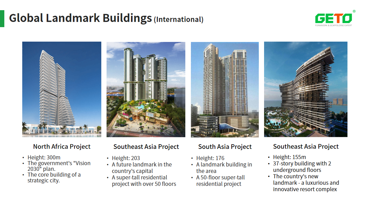 Como empresa nacional de alta tecnología y una de las 500 principales empresas chinas que cotizan en bolsa, GETO ya ha demostrado su sólida posición en el mercado global. Actualmente, GETO cuenta con 12 importantes bases de producción en todo el mundo, que prestan servicios a más de 60 países. La marca internacional "GETO®" está registrada en 32 países y regiones. GETO también ha obtenido las principales certificaciones internacionales, como la CIDB G7 de Malasia y la BAND-2 de Singapur, lo que la convierte en el socio predilecto para numerosos proyectos multinacionales de ingeniería.