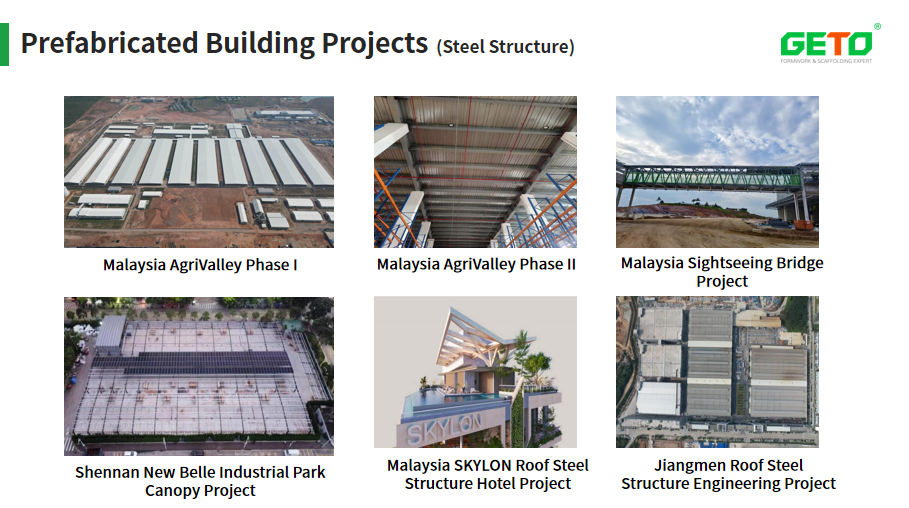 - Proyecto de granja lechera de Malasia (instalación agrícola a gran escala), Proyecto de hotel con estructura de acero para techo SKYLON de Malasia (techo de forma irregular), que muestra las capacidades de GETO en el diseño y construcción de estructuras de acero de gran longitud.