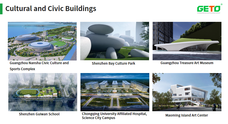 Edificios públicos: Complejo Cívico, Cultural y Deportivo Nansha en Cantón (un recinto de gran escala), Plaza Cultural de la Bahía de Shenzhen (espacio cultural irregular), Museo de Arte Zhenbao de Cantón (precisión en el espacio artístico), Escuela Guiwan en Shenzhen (infraestructura educativa), Campus de la Ciudad Científica del Hospital Afiliado a la Universidad de Chongqing (arquitectura médica compleja) y Centro de Arte de la Isla de Maoming (entorno costero especial) en China. Estos proyectos demuestran los altos estándares y los complejos requisitos de construcción necesarios para brindar servicios precisos a diversas infraestructuras públicas.